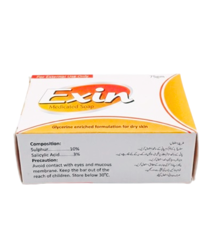 Exin is a premium medicated cleansing bar. Expertly formulated with Sulphur and Salicylic Acid, it actively treats fungal infections, scabies, and severe acne while utilizing glycerine to restore your skin’s natural moisture balance.