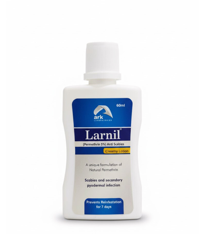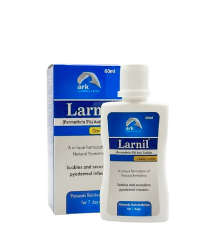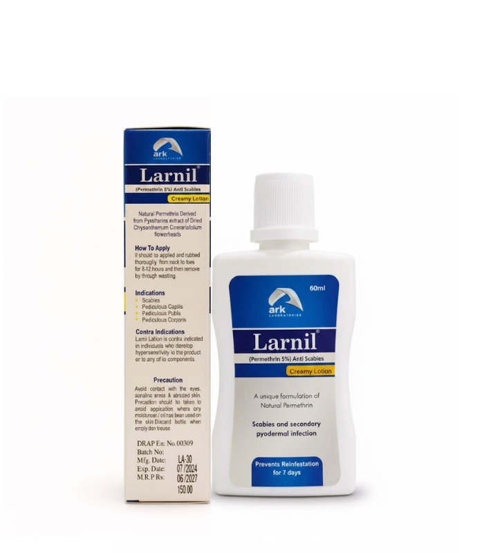 Larnil is a specialized creamy lotion containing 5% Permethrin, a highly effective anti-parasitic agent derived from the natural extract of dried Chrysanthemum cinerariaefolium flower heads. Clinically designed to treat scabies and related secondary infections, Larnil provides a robust defense against infestation while preventing recurrence.